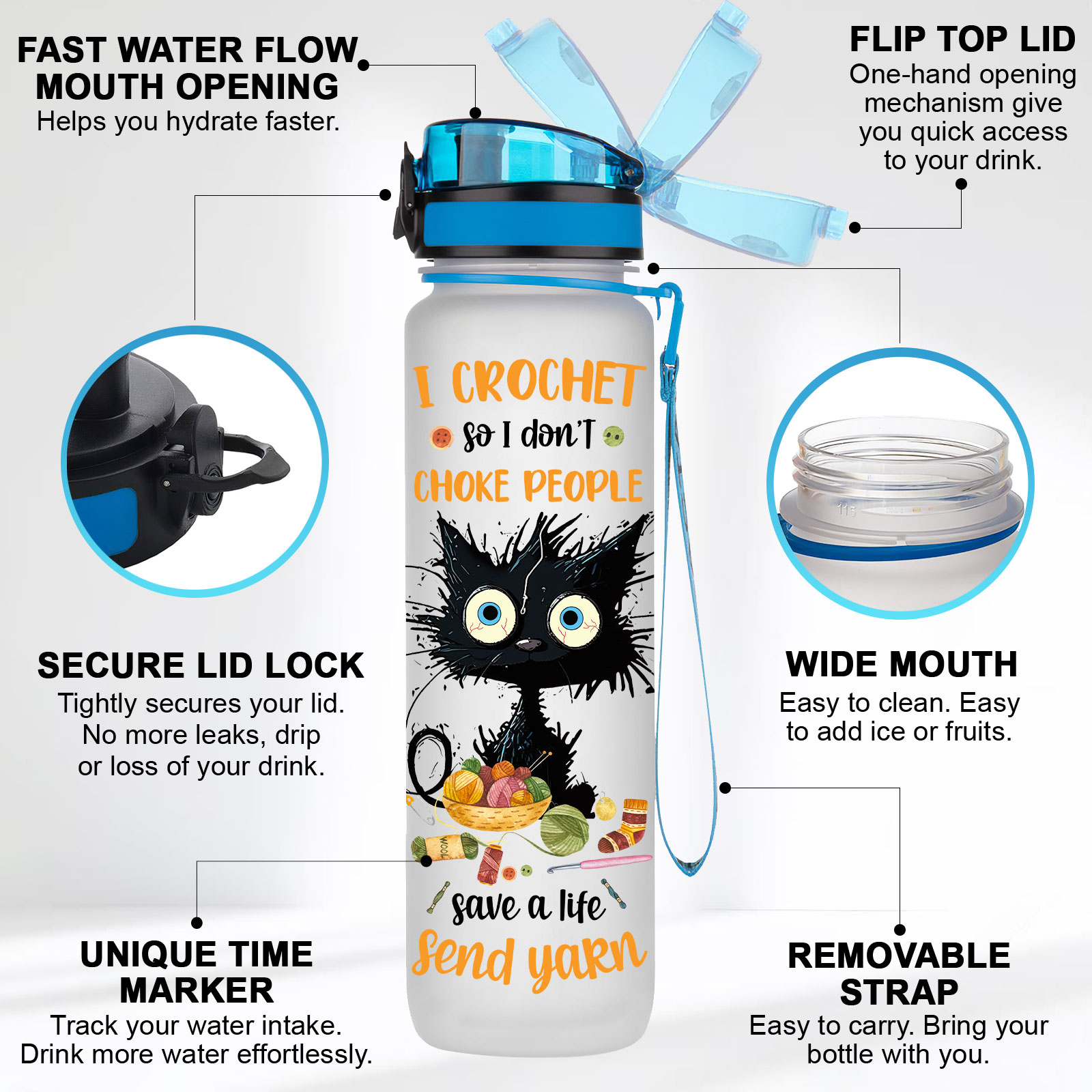 - The bottle includes a convenient time marker feature on the side, helping you monitor your water consumption throughout the day.
